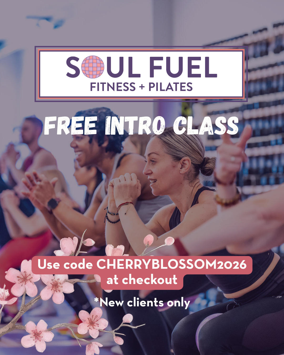 Enjoy a free intro class at SOUL FUEL Fitness + Pilates! Simply choose your class on their website and use promo code CHERRYBLOSSOM2026 at checkout. For new clients only. Expires May 31st.
